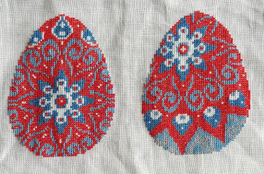 Het tweede ei is klaar. Vanmorgen  heb ik daarbij de laatste witte steekjes gekruist. Nog één te gaan!
